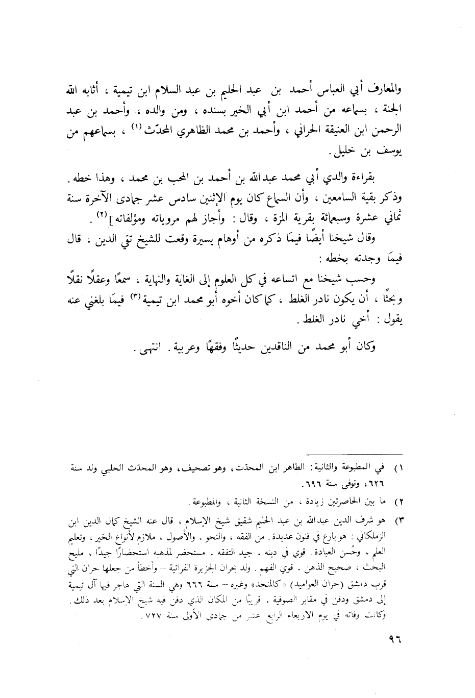 وَمن مؤلفاته العزيزة الادراك درة الاسلاك فِي دولة الاتراك قَالَ فِيهِ فِي تَرْجَمَة سنة ثَمَان وَعشْرين وَسَبْعمائة وفيهَا توفّي شيخ الاسلام تَقِيّ الدّين أَبُو الْعَبَّاس أَحْمد بن عبد الْحَلِيم بن عبد السَّلَام بن عبد الله بن أبي الْقَاسِم بن مُحَمَّد ابْن تَيْمِية الْحَرَّانِي الْحَنْبَلِيّ بَحر زاخر فِي النقليات وَحبر ماهر فِي حفظ عقائل العقليات وَإِمَام فِي معرفَة الْكتاب وَالسّنة وَهَمَّام لَا يمِيل الى حلاوة من الْمِنَّة كَانَ ذَا ورع زَائِد وزهد فَرعه فِي روض الرضى مائد وسخاء وشجاعة وعزلة وقناعة وتصانيف مَشْهُورَة وفتاوى اعلامها منشورة يصدع بِالْحَقِّ وَيتَكَلَّم فِيمَا جلّ ودق وَيَأْمُر بِالْمَعْرُوفِ وَينْهى عَن الْمُنكر ويثابر على اقامة الْحُدُود ان شكر وان لم يشْكر كتب قَاضِي الْقُضَاة أَبُو الْمَعَالِي مُحَمَّد بن الزملكاني على بعض مصنفاته ... مَاذَا يَقُول الواصفون لَهُ ... وَصِفَاته جلت عَن الْحصْر