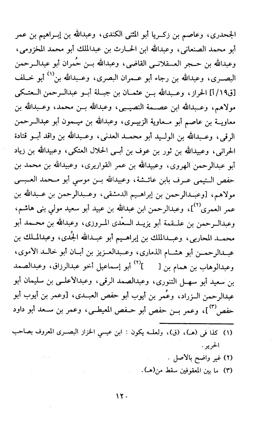الجحدري، وعاصم بن زكريا أبو المثنى الكندي، وعبد الله بن إبراهيم بن عمر أبو محمد الصنعاني، وعبد الله ابن الحارث بن عبد الملك أبو محمد المخزومي، وعبد الله بن حجر العسقلاني القاضي، وعبد الله بن حمران أبو عبد الرحمن البصري، وعبد الله بن رجاء أبو عمران البصري، وعبد الله بن أبو خلف الحراز، وعبد الله بن عثمان بن جبلة أبو عبد الرحمن العتكي مولاهم، وعبد الله ابن عصمة النصيبي وعبد الله بن محمد، وعبد الله بن معاوية بن عاصم أبو معاوية الزبيري، وعبد الله بن ميمون أبو عبد الرحمن الرقي، وعبد الله بن الوليد أبو محمد العدني، وعبد الله بن واقد أبو قتادة الحراني، وعبيد الله بن ثور بن عوف بن أبي الحلال العتكي، وعبيد الله بن زياد أبو عبد الرحمن الهروي، وعبيد الله بن عمر القواريري، وعبيد الله بن محمد بن حفص التيمي عرف بابن عائشة، وعبيد الله بن موسى أبو محمد العبسي مولاهم، [وعبد الرحمن بن إبراهيم الدمشقي، وعبد الرحمن بن عبد الله بن عمر العمري، وعبد الرحمن ابن عبد الله بن عبيد أبو سعيد مولى بني هاشم، وعبد الرحمن بن علقمة أبو يزيد السعدي المروزي، وعبد الله بن محمد أبو محمد المحاربي، وعبد الملك بن إبراهيم أبو عبد الله الجدي، وعبد الملك بن عبد الرحمن أبو هشام الذماري، وعبد العزيز بن أبان أبو خالد الأموي، وعبد الوهاب بن همام بن [. .] أبو إسماعيل أخو عبد الرزاق، وعبد الصمد بن سعيد أبو سهل التنوري، وعبد الصمد الرقي، وعبد الأعلى بن سليمان أبو عبد الرحمن الزراد، وعمر بن أيوب أبو حفص العبدي، [وعمر بن أيوب أبو حفص]، وعمر بن حفص أبو حفص المعيطي، وعمر بن سعد أبو داود
