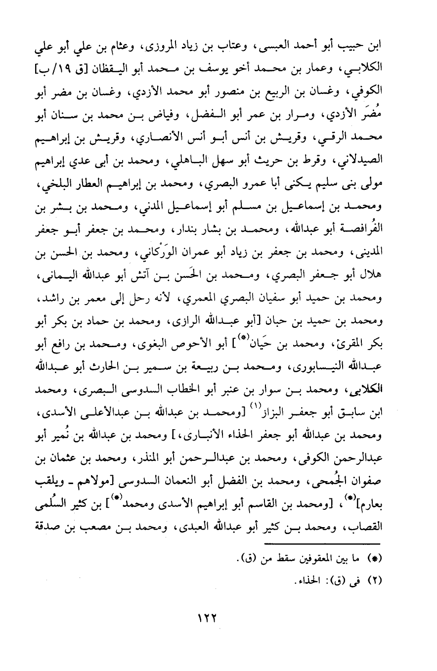 ابن حبيب أبو أحمد العبسي، وعتاب بن زياد المروزي، وعثام بن علي أبو علي الكلابي، وعمار بن محمد أخو يوسف بن محمد أبو اليقظان الكوفي، وغسان بن الربيع بن منصور أبو محمد الأزدي، وغسان بن مضر أبو مضر الأزدي، ومرار بن عمر أبو الفضل، وفياض بن محمد بن سنان أبو محمد الرقي، وقريش بن أنس أبو أنس الأنصاري، وقريش بن إبراهيم الصيدلاني، وقرط بن حريث أبو سهل الباهلي، ومحمد بن أبي عدي إبراهيم مولى بني سليم يكنى أبا عمرو البصري، ومحمد بن إبراهيم العطار البلخي، ومحمد بن إسماعيل بن مسلم أبو إسماعيل المدني، ومحمد بن بشر بن الفرافصة أبو عبد الله، ومحمد بن بشار بندار، ومحمد بن جعفر أبو جعفر المديني، ومحمد بن جعفر بن زياد أبو عمران الوركاني، ومحمد بن الحسن بن هلال أبو جعفر البصري، ومحمد بن الحسن بن آتش أبو عبد الله اليماني، ومحمد بن حميد أبو سفيان البصري المعمري، لأنه رحل إلى معمر بن راشد، ومحمد بن حميد بن حبان [أبو عبد الله الرازي، ومحمد بن حماد بن بكر أبو بكر المقرئ، ومحمد بن حيان] أبو الأحوص البغوي، ومحمد بن رافع أبو عبد الله النيسابوري، ومحمد بن ربيعة بن سمير بن الحارث أبو عبد الله الكلابي، ومحمد بن سوار بن عنبر أبو الخطاب السدوسي البصري، ومحمد بن سابق أبو جعفر البزاز [ومحمد بن عبد الله بن عبد الأعلى الأسدي، ومحمد بن عبد الله أبو جعفر الحذاء الأنباري]، ومحمد بن عبد الله بن نمير أبو عبد الرحمن الكوفي، ومحمد بن عبد الرحمن أبو المنذر، ومحمد بن عثمان بن صفوان الجمحي، ومحمد بن الفضل أبو النعمان السدوسي [مولاهم - يلقب بعارم]، [ومحمد بن القاسم أبو إبراهيم الأسدي ومحمد] بن كثير السلمي القصاب، ومحمد بن كثير أبو عبد الله العبدي، ومحمد بن مصعب بن صدقة