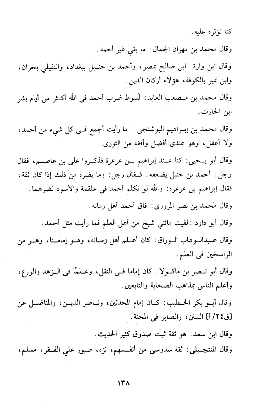 فقال رجل: وما يضره من ذلك إذا كان ثقة، فقال إبراهيم بن عرعرة: والله لو تكلم أحمد في علقمة والأسود لضرهما.