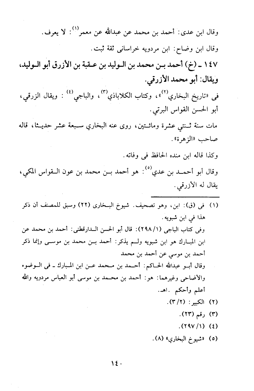 147 - (خ) أحمد بن محمد بن الوليد بن عقبة بن الأزرق أبو الوليد، ويقال: أبو محمد الأزرقي.