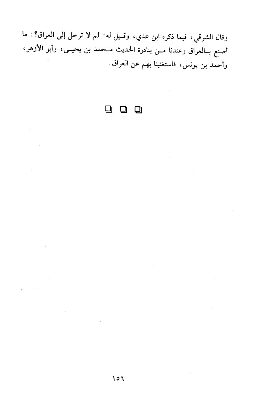 وقال الشرقي، فيما ذكره ابن عدي، وقيل له: لم لا ترحل إلى العراق؟ ما أصنع بالعراق وعندنا من بنادرة الحديث محمد بن يحيى، وأبو الأزهر، وأحمد بن يونس، فاستغنينا بهم عن العراق.