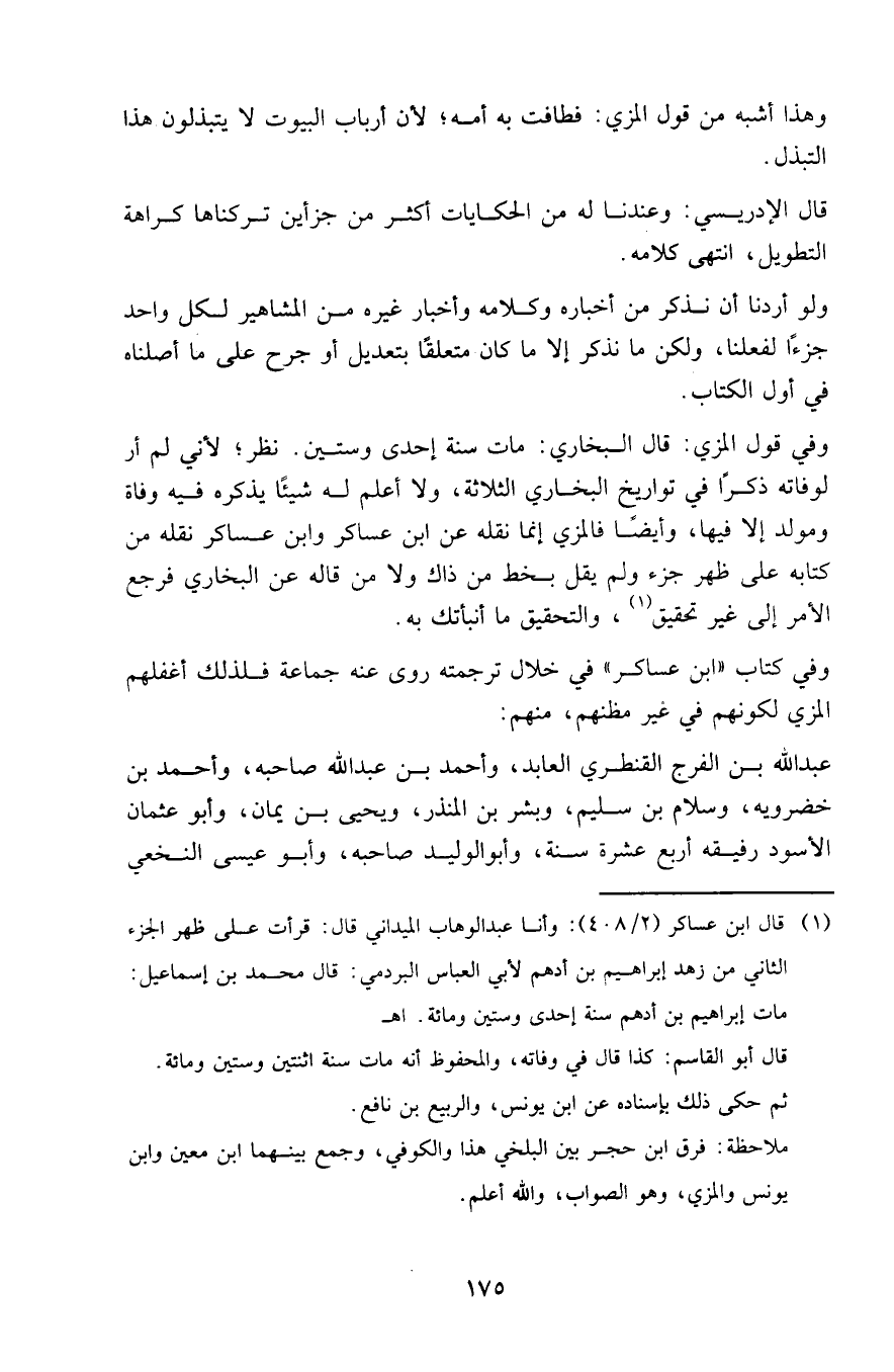 وفي قول المزي: قال البخاري: مات سنة إحدى وستين، نظر، لأني لم أر لوفاته ذكرا في تواريخ البخاري الثلاثة، ولا أعلم له شيئا يذكره، فيه وفاة ومولد إلا فيها، وأيضا فالمزي إنما نقله عن ابن عساكر وابن عساكر نقله من كتابه على ظهر جزء ولم يقل بخط من ذاك ولا من قاله عن البخاري فرجع الأمر إلى غير تحقيق، والتحقيق ما أنبأتك به.