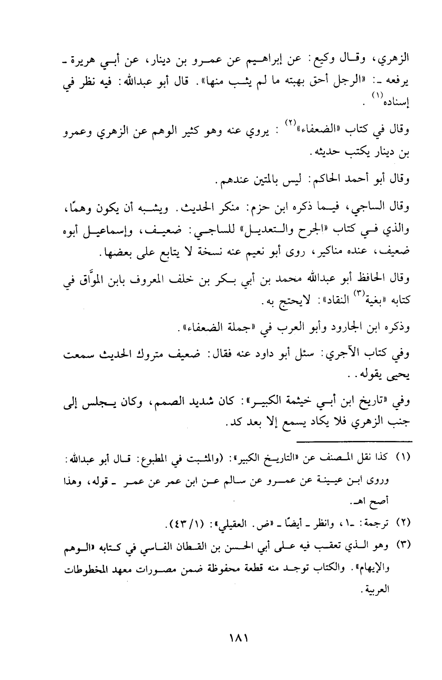 وقال في كتاب " الضعفاء ": يروي عنه وهو كثير الوهم عن الزهري وعمرو بن دينار يكتب حديثه. وقال أبو أحمد الحاكم: ليس بالمتين عندهم.