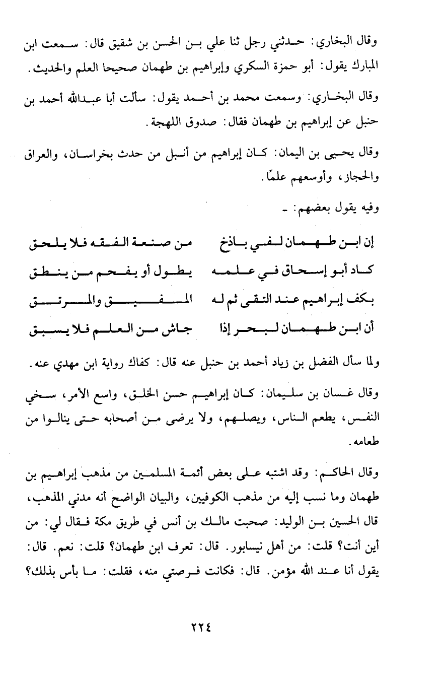 وقال البخاري: وسمعت محمد بن أحمد يقول: سألت أبا عبد الله أحمد بن حنبل عن إبراهيم بن طهمان فقال: صدوق اللهجة.