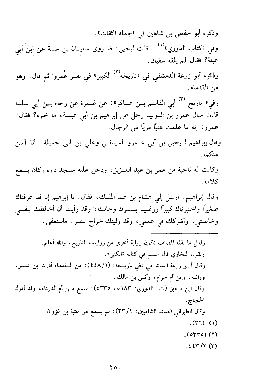 وفي " تاريخ أبي القاسم بن عساكر ": عن ضمرة عن رجاء بن أبي سلمة قال: سأل عمرو بن الوليد رجلا عن إبراهيم بن أبي عبلة، ما خبره؟ فقال: عمرو إنه ما علمت هنيا مريا من الرجال.