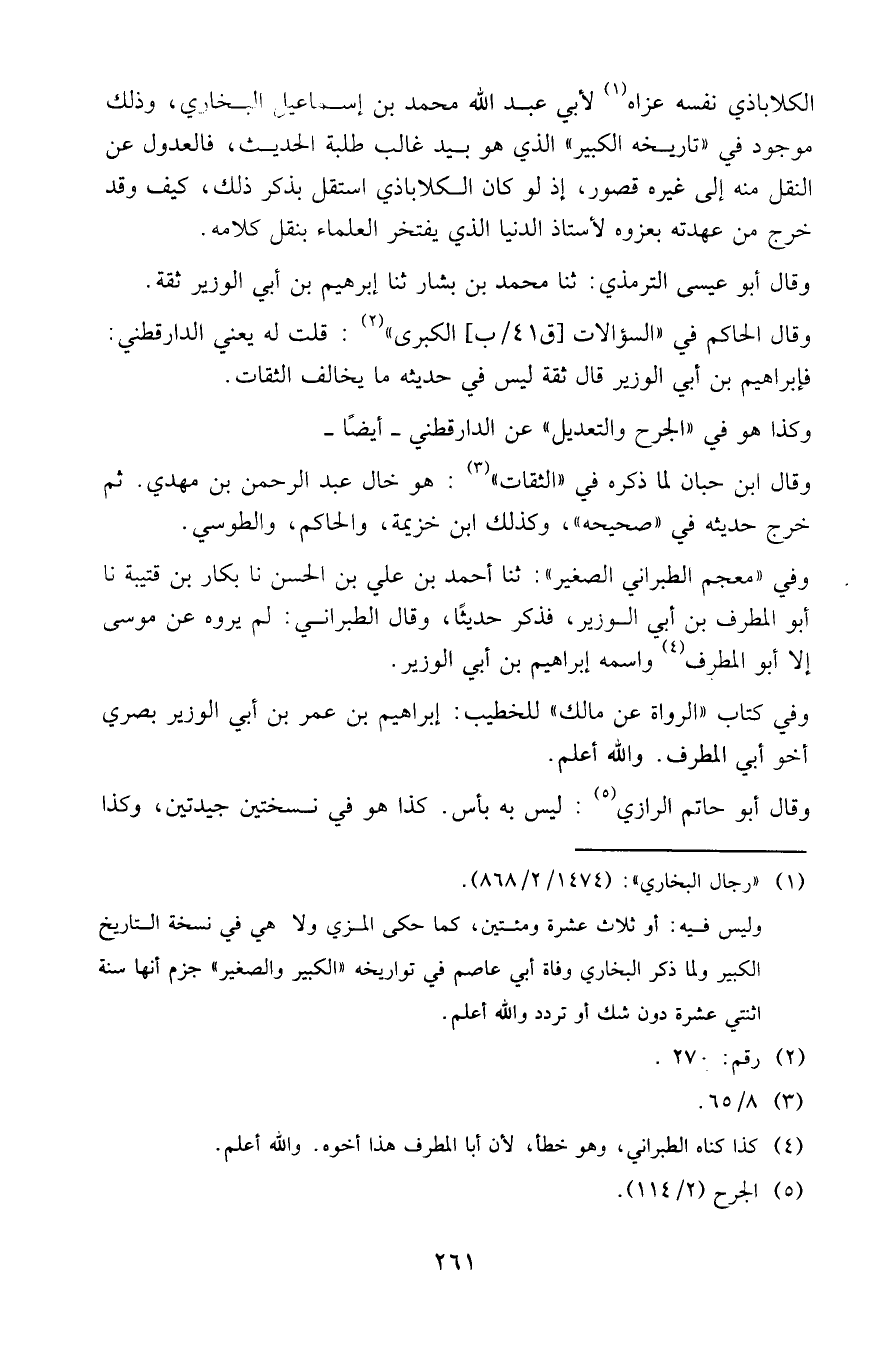 الكلاباذي نفسه عزاه لأبي عبد الله محمد بن إسماعيل البخاري، وذلك موجود في " تاريخه الكبير " الذي هو بيد غالب طلبة الحديث، فالعدول عن النقل منه إلى غيره قصور، إذ لو كان الكلاباذي استقل بذكر ذلك، كيف وقد خرج من عهدته بعزوه لأستاذ الدنيا الذي يفتخر العلماء بنقل كلامه.