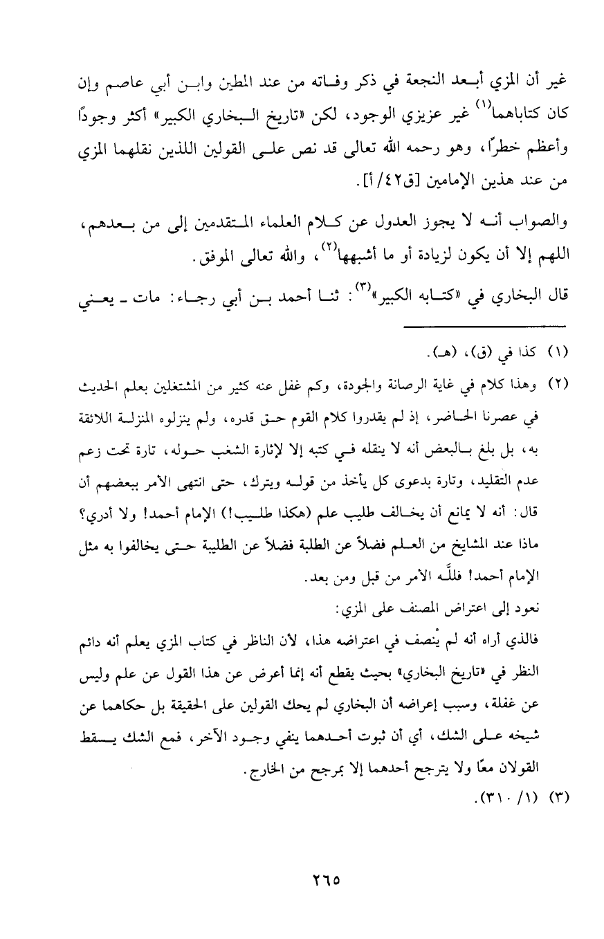 غير أن المزي أبعد النجعة في ذكر وفاته من عند المطين وابن أبي عاصم وإن كان كتاباهما غير عزيزي الوجود، لكن " تاريخ البخاري الكبير " أكثر وجودا وأعظم خطارا، وهو رحمه الله تعالى قد نص على القولين اللذين نقلهما المزي من عند هذين الإمامين.