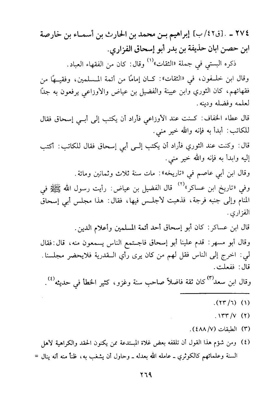 274 - إبراهيم بن محمد بن الحارث بن أسماء بن خارصة ابن حصن ابان حذيفة بن بدر أبو إسحاق الفزاري.
