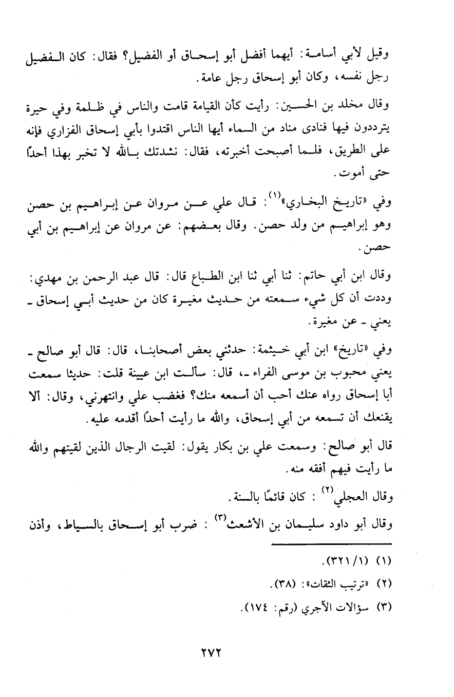 وقيل لأبي أسامة: أيهما أفضل أبو إسحاق أو الفضيل؟ فقال: كان الفضيل رجل نفسه، وكان أبو إسحاق رجل عامة.