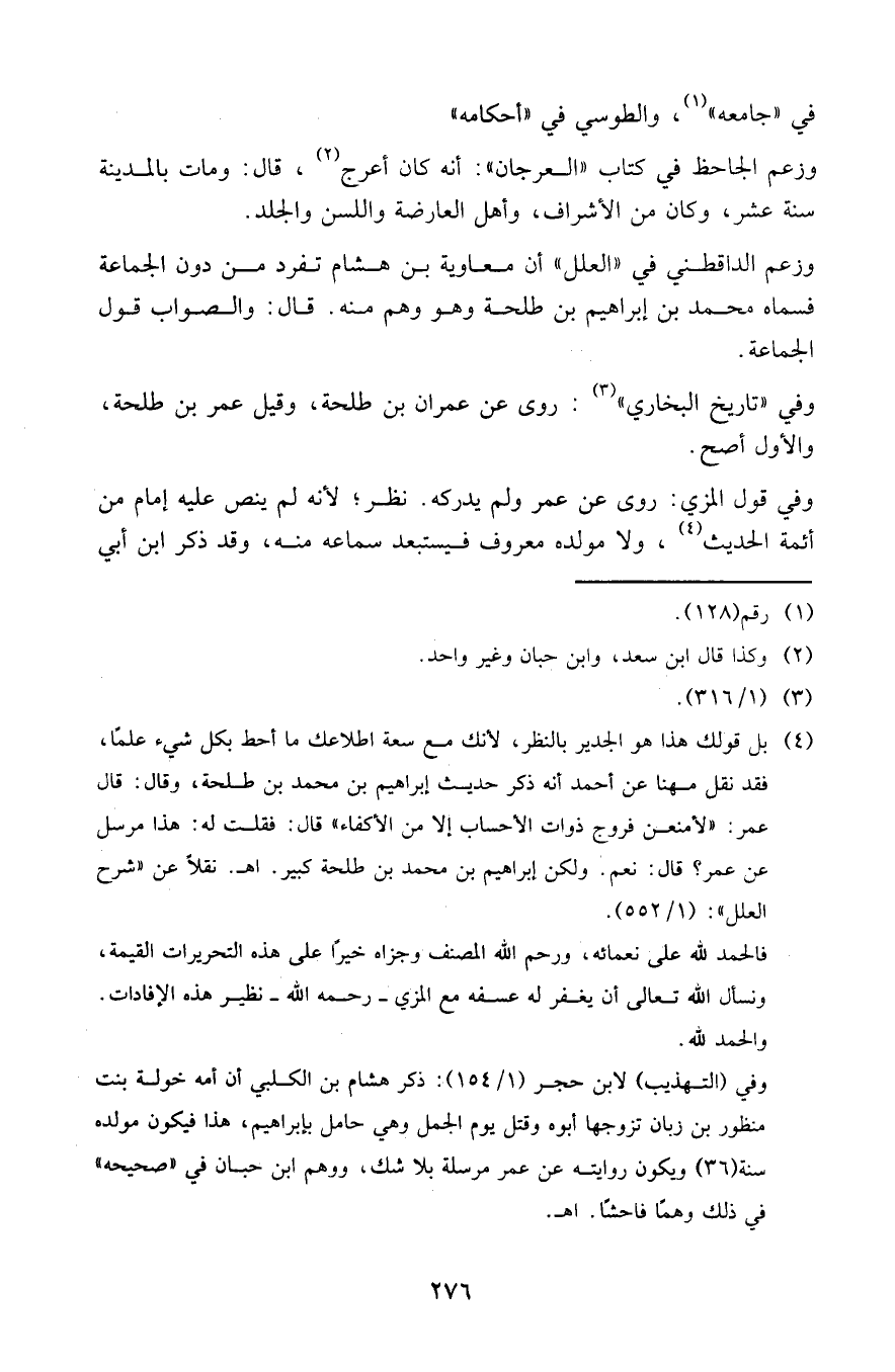 وزعم الدارقطني في " العلل " أن معاوية بن هشام تفرد من دون الجماعة فسماه محمد بن إبراهيم بن طلحة وهو وهم منه. قال: والصواب قول الجماعة.