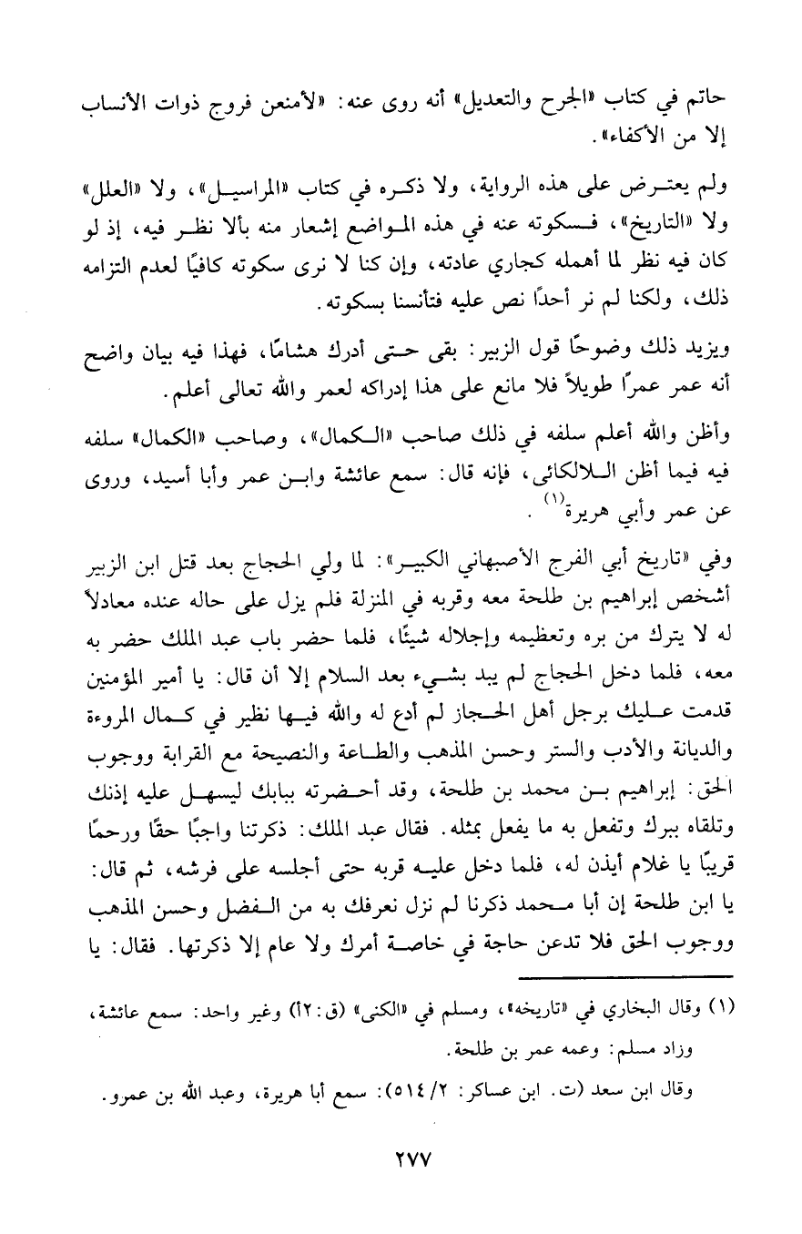 حاتم في كتاب " الجرح والتعديل " أنه روى عنه: " لأمنعن فروج ذوات الأنساب إلا من الأكفاء ". ولم يعترض على هذه الرواية، ولا ذكره في كتاب " المراسيل "، ولا " العلل " ولا " التاريخ "، فسكوته عنه في هذه المواضع إشعار منه بألا نظر فيه، إذ لو كان فيه نظر لما أهمله كجاري عادته، وإن كنا لا نرى سكوته كافيا لعدم التزامه ذلك، ولكنا لم نر أحدا نص عليه فتأنسنا بسكوته.