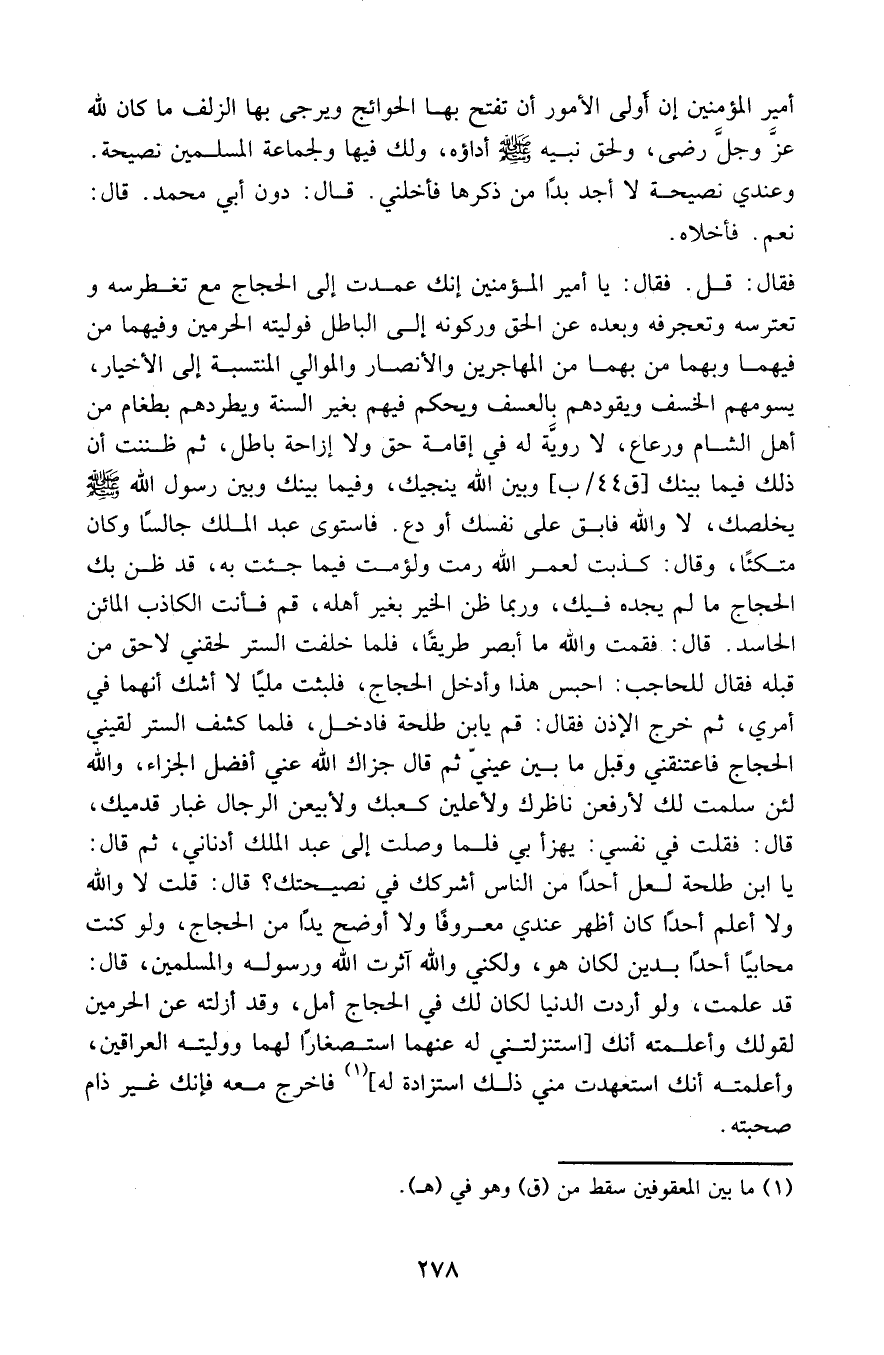 أمير المؤمنين إن أولى الأمور أن تفتح بها الحوائج ويرجى بها الزلف ما كان لله عز وجل رضى، ولحق نبيه صلى الله عليه وسلم أداؤه، ولك فيها ولجماعة المسلمين نصيحة. وعندي نصيحة لا أجد بدا من ذكرها فأخلني. قال: دون أبي محمد. قال: نعم. فأخلاه. فقال: قل. فقال: يا أمير المؤمنين إنك عمدت إلى الحجاج مع تغطرسه وتعترسه وتعجرفه وبعده عن الحق وركونه إلى الباطل فوليته الحرمين وفيهما من فيهما وبهما من بهما من المهاجرين والأنصار والموالي المنتسبة إلى الأخيار، يسومهم الخسف ويقودهم بالعسف ويحكم فيهم بغير السنة ويطردهم بطغام من أهل الشام ورعاع، لا روية له في إقامة حق ولا إزاحة باطل، ثم ظننت أن ذلك فيما بينك وبين الله ينجيك، وفيما بينك وبين رسول الله صلى الله عليه وسلم يخلصك، لا والله فابق على نفسك أو دع.