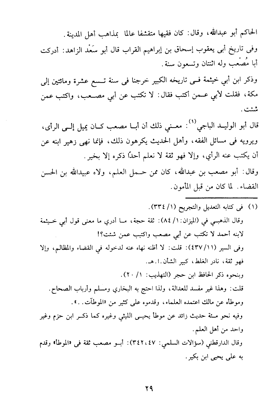 قال أبو الوليد الباجي: معنى ذلك أن أبا مصعب كان يميل إلى الرأي، ويرويه في مسائل الفقه، وأهل الحديث يكرهون ذلك، فإنما نهى زهير ابنه عن أن يكتب عنه الرأي، وإلا فهو ثقة لا نعلم أحدا ذكره إلا بخير.