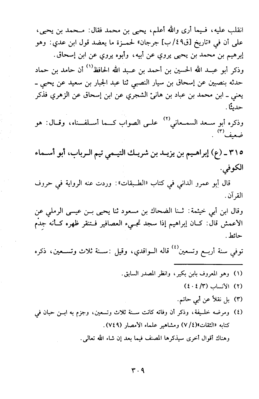 انقلب عليه، فيما أرى والله أعلم، يحيى بن محمد فقال: محمد بن يحيى، على أن في " تاريخ جرجان " لحمزة ما يعضد قول ابن عدي: وهو إبراهيم بن محمد بن يحيى يروي عن أبيه، وأبوه يروي عن ابن إسحاق.