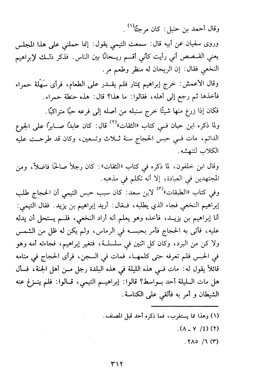 ولما ذكره ابن حبان في كتاب " الثقات " قال: كان عابدا صابرا على الجوع الدائم، مات في حبس الحجاج سنة ثلاث وتسعين، وكان قد طرحت عليه الكلاب لتنهشه.