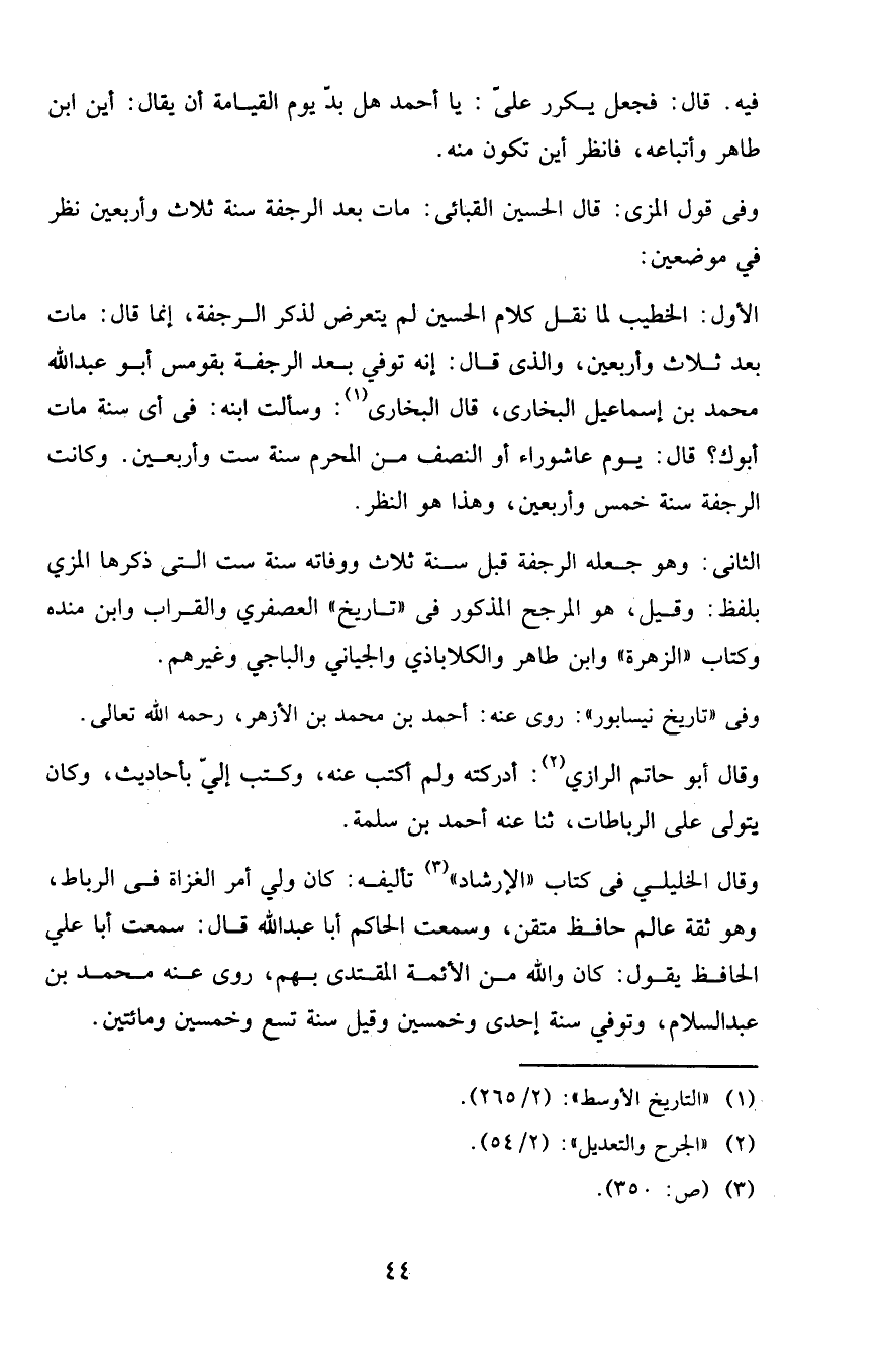 وفي قول المزي: قال الحسين القبائي: مات بعد الرجفة سنة ثلاث وأربعين. نظر في موضعين: الأول: الخطيب لما نقل كلام الحسين لم يتعرض لذكر الرجفة، إنما قال: مات بعد ثلاث وأربعين، والذي قال: إنه توفي بعد الرجفة بقومس أبو عبد الله محمد بن إسماعيل البخاري، قال البخاري: وسألت ابنه: في أي سنة مات أبوك؟ قال: يوم عاشوراء أو النصف من المحرم سنة ست وأربعين وكانت الرجفة سنة خمس وأربعين، وهذا هو النظر.
