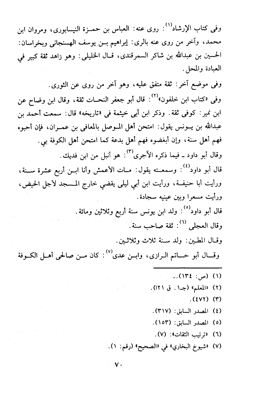 قال أبو داود: وسمعته يقول: مات الأعمش وأنا ابن أربع عشرة سنة، ورأيت أبا حنيفة، ورأيت ابن أبي ليلى يقضي خارج المسجد لأجل الحيض، ورأيت مسعرا وبين عينيه سجادة.