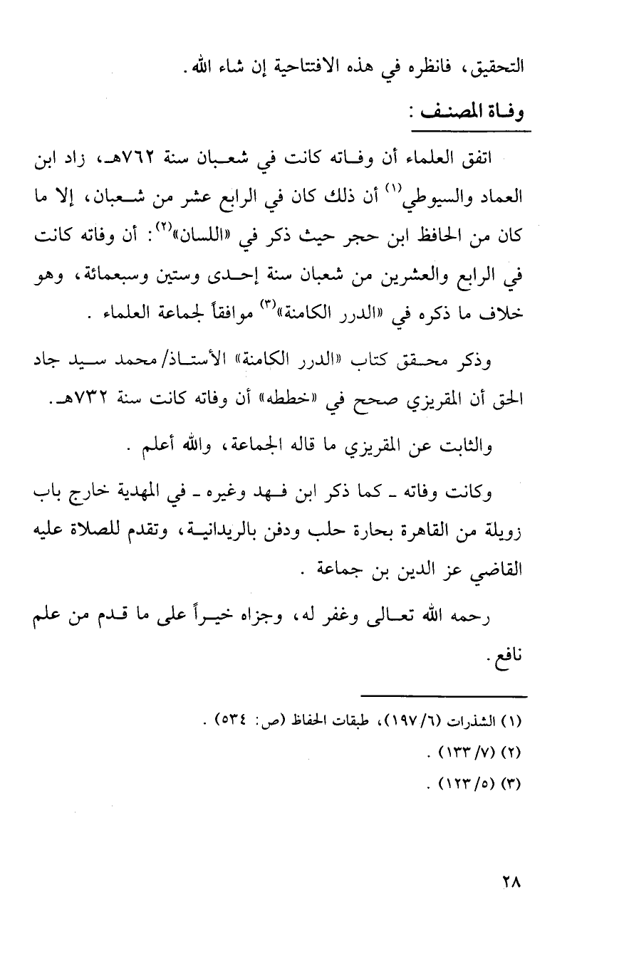 وذكر محقق كتاب (الدرر الكامنة) الأستاذ/ محمد سيد جاد الحق أن المقريزي صحح في (خططه) أن وفاته كانت سنة 732 هـ.