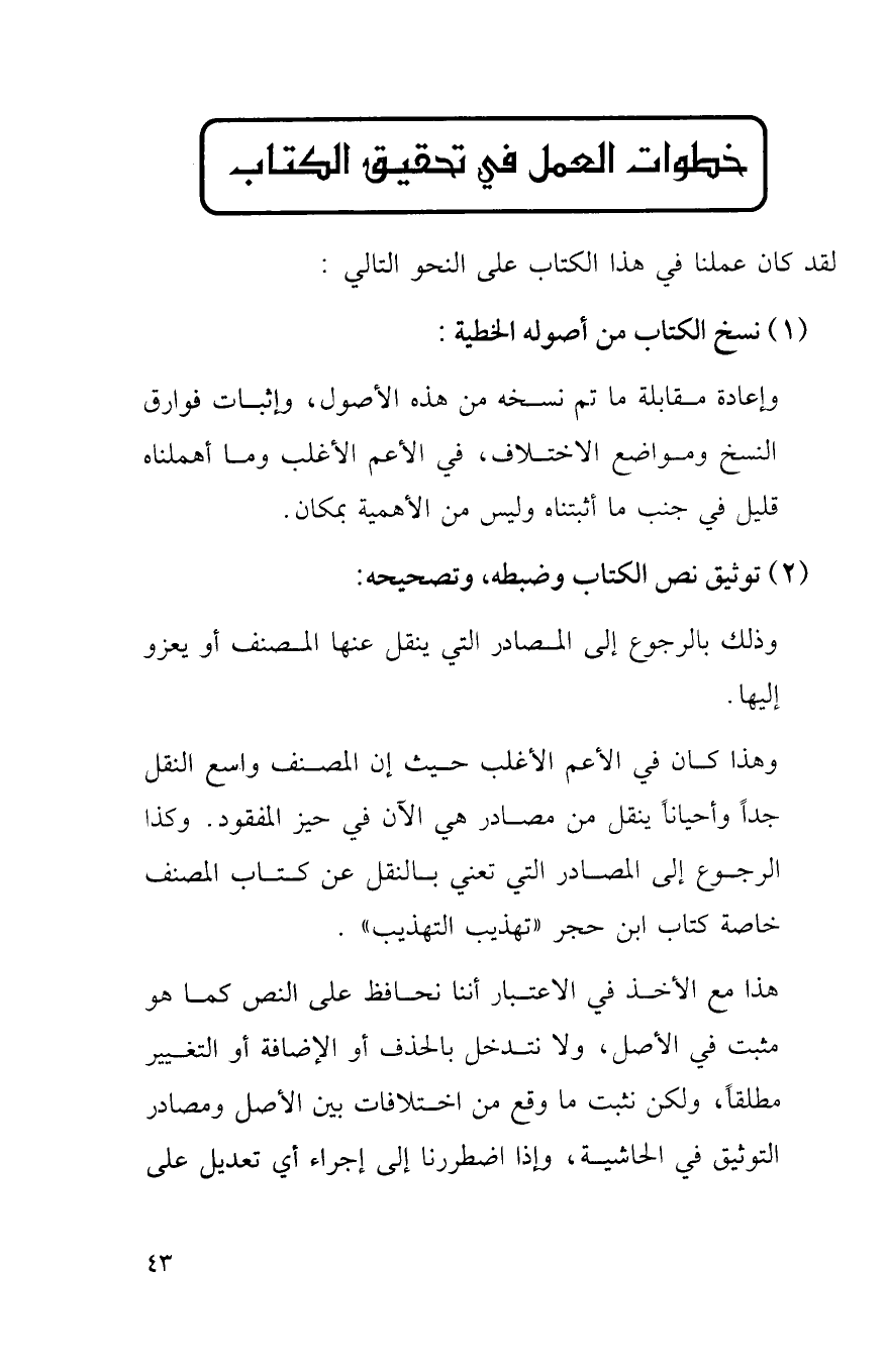 هذا مع الأخذ في الاعتبار أننا نحافظ على النص كما هو مثبت في الأصل، ولا نتدخل بالحذف أو الإضافة أو التغيير مطلقا، ولكن نثبت ما وقع من اختلافات بين الأصل ومصادر التوثيق في الحاشية، وإذا اضطررنا إلى إجراء أي تعديل على