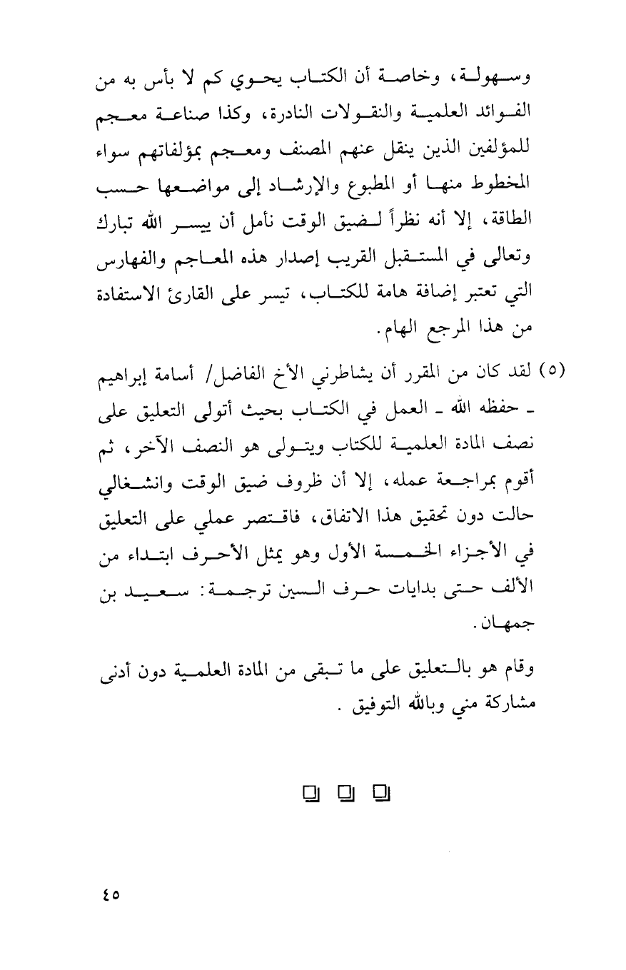 (5) لقد كان من المقرر أن يشاطرني الأخ الفاضل / أسامة إبراهيم - حفظه الله - العمل في الكتاب بحيث أتولى التعليق على نصف المادة العلمية للكتاب ويتولى هو النصف الآخر، ثم أهوم بمراجعة عمله، إلا أن ظروف ضيق الوقت وانشغالي حالت دون تحقيق هذا الاتفاق، فاقتصر عملي على التعليق في الأجزاء الخمسة الأول وهو يمثل الأحرف ابتداء من الألف حتى بدايات حرف السين ترجمة: سعيد بن جمهان.