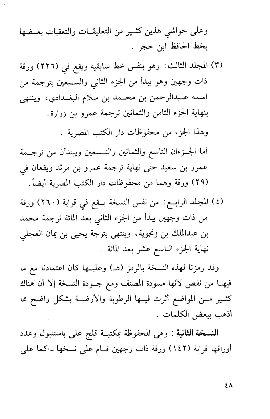 (4) المجلد الرابع: من نفس النسخة يقع في قرابة (260) ورقة من ذات وجهين يبدأ من الجزء الثاني بعد الماءة ترجمة محمد بن عبد الملك بن زنجويه، وينتهى بترجمة يحيى بن يمان العجلي نهاية الجزء التاسع عشر بعد المائة.