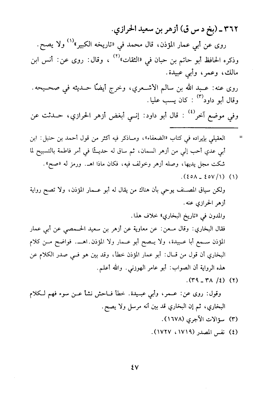 وفي موضع آخر: قال أبو داود: إني أبغض أزهر الحرازي، حدثت عن