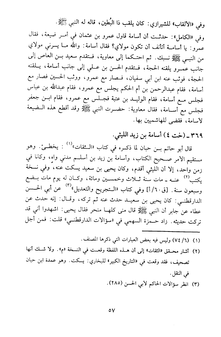 وفي «الكامل»: حدثت أن أسامة قاول عمرو بن عثمان في أمر ضيعة، فقال عمرو: يا أسامة أتأنف أن تكون مولاي؟ فقال أسامة: والله ما يسرني مولاي من النبي صلى الله عليه وسلم نسبك.