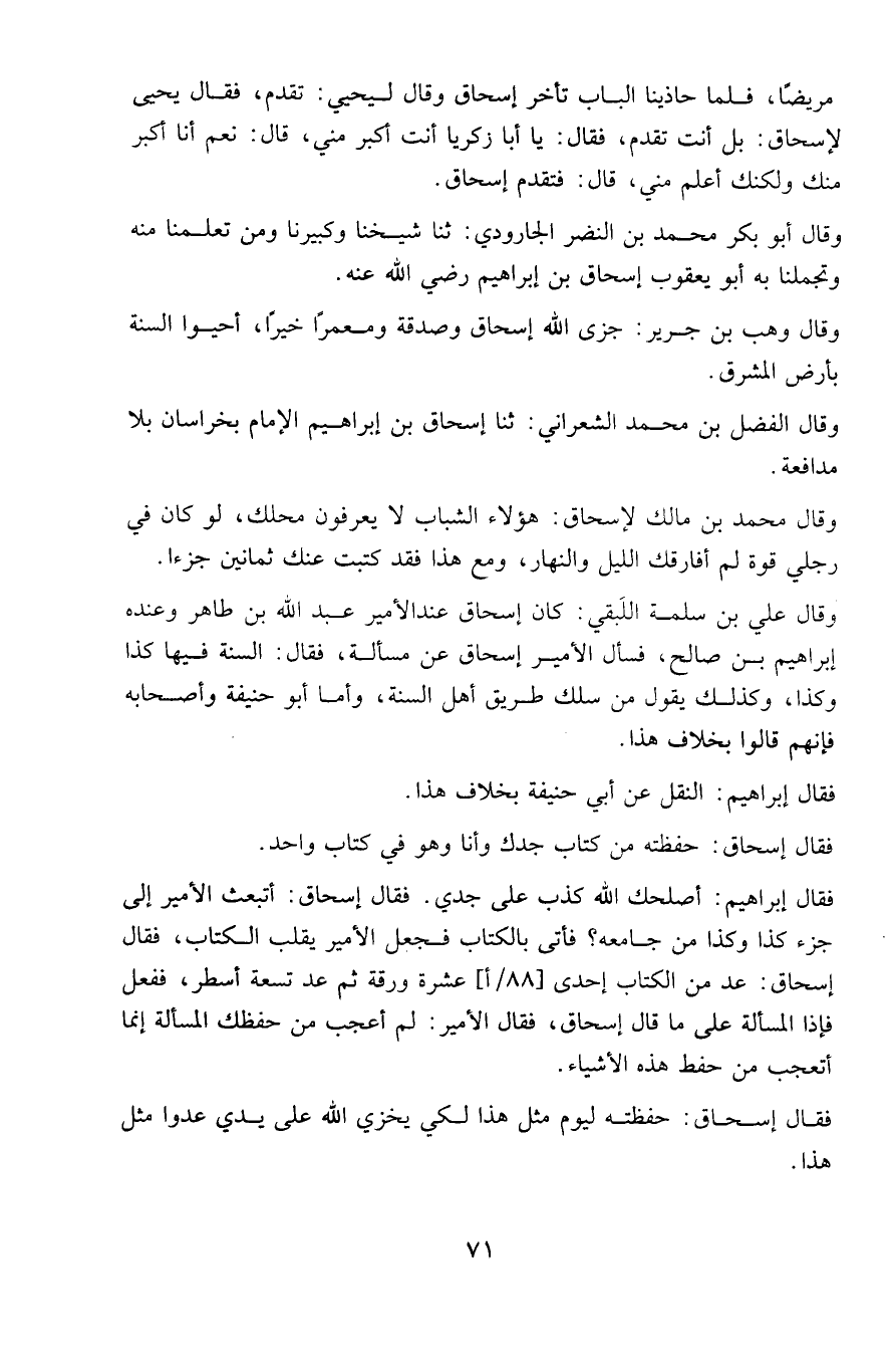 فقال إسحاق: أتبعث الأمير إلى جزء كذا وكذا من جامعه؟ فأتى بالكتاب فجعل الأمير يقلب الكتاب، فقال إسحاق: عد من الكتاب إحدى [88 / أ] عشرة ورقة ثم عد تسعة أسطر، ففعل فإذا المسألة على ما قال إسحاق، فقال الأمير: لم أعجب من حفظك المسألة إنما أتعجب من حفظ هذه الأشياء.