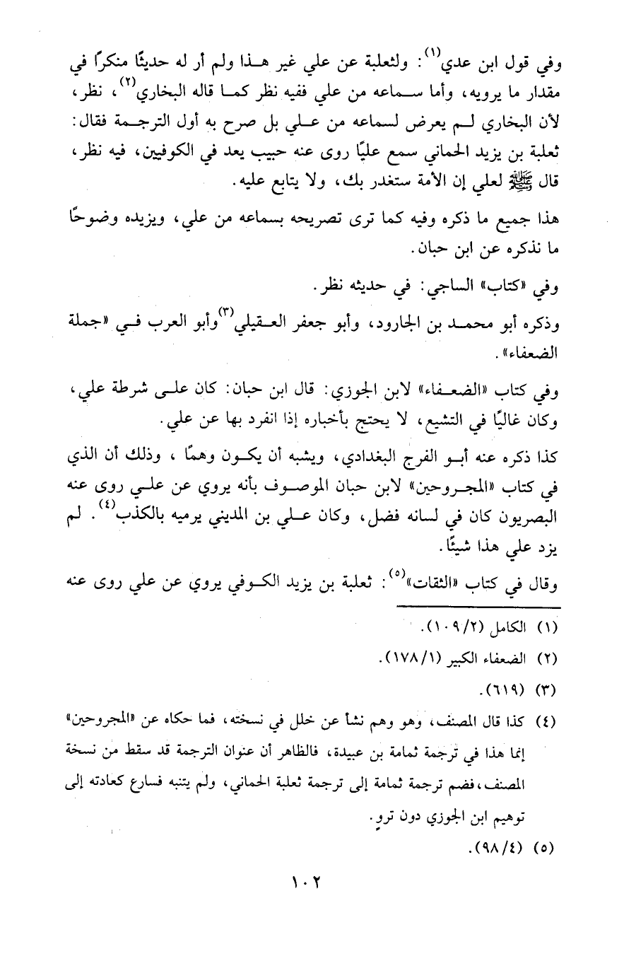 وفي قول ابن عدي: ولثعلبة عن علي غير هذا ولم أر حديثا منكرا في مقدار ما يرويه، وأما سماعه من علي ففيه نظر، كما قاله البخاري، نظر، لأن البخاري لم يعرض لسماعه من علي بل صرح به أول الترجمة فقال: ثعلبة بن يزيد الحماني سمع عليا روى عنه حبيب يعد في الكوفيين، فيه نظر، قال صلى الله عليه وسلم لعلي: إن الأمة ستغدر بك، ولا يتابع عليه.