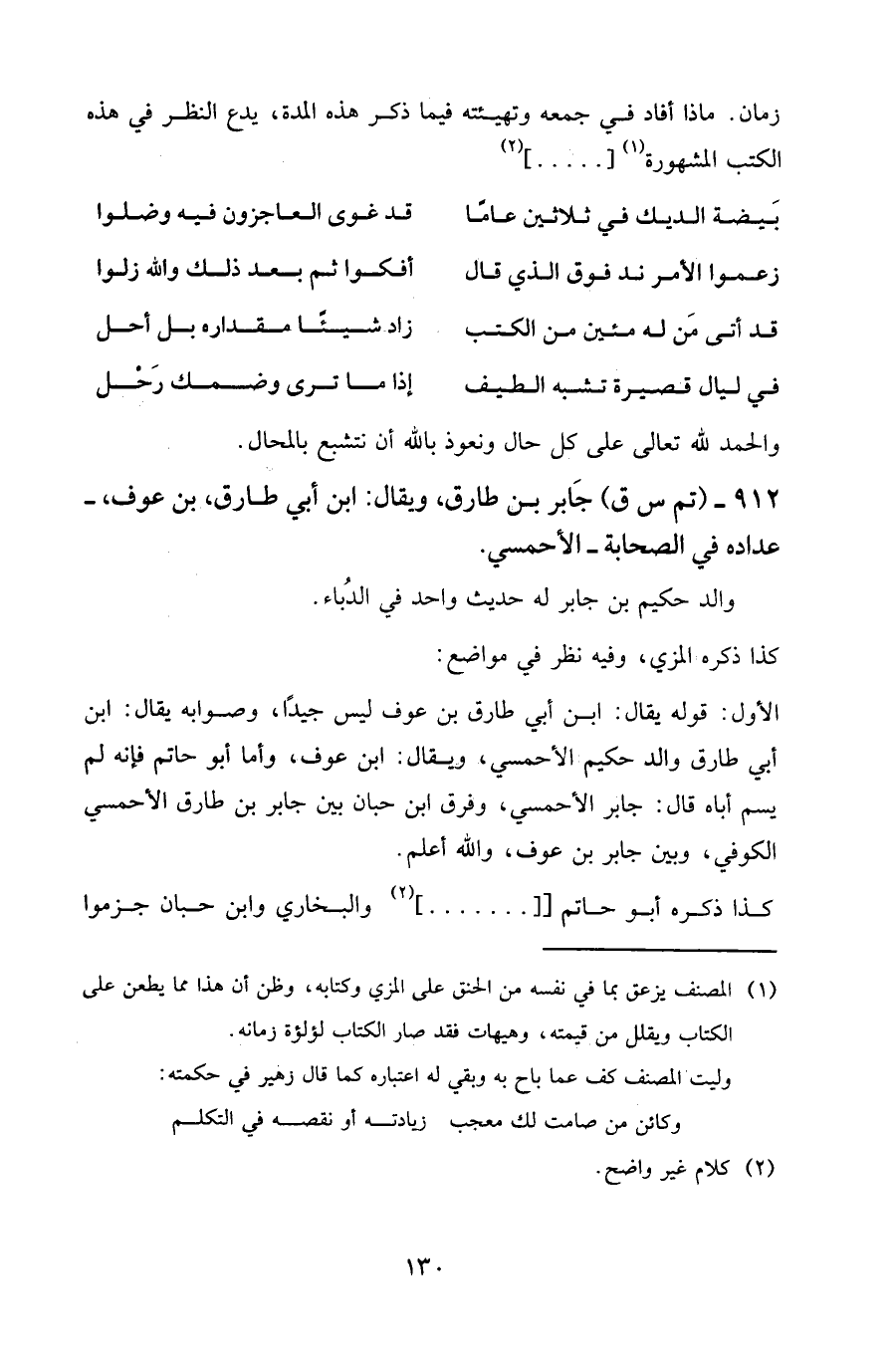 الأول: قوله يقال: ابن أبي طارق بن عوف ليس جيدا، وصوابه يقال: ابن أبي طارق والد حكيم الأحمسي، ويقال: ابن عوف، وأما أبو حاتم فإنه لم يسم أباه قال: جابر الأحمسي، وفرق ابن حبان بين جابر بن طارق الأحمسي الكوفي، وبين جابر بن عوف، والله أعلم.