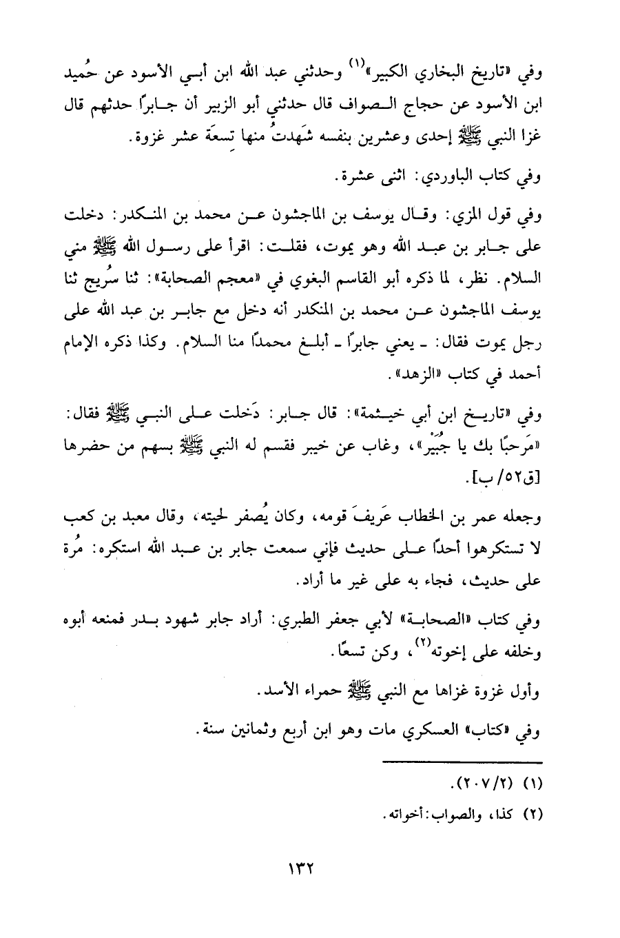وفي «تاريخ البخاري الكبير» وحدثني عبد الله ابن أبي الأسود عن حميد بن الأسود عن حجاج الصواف قال: حدثني أبو الزبير أن جابرا حدثهم قال: غزا النبي صلى الله عليه وسلم إحدى وعشرين بنفسه شهدت منها تسع عشرة غزوة.