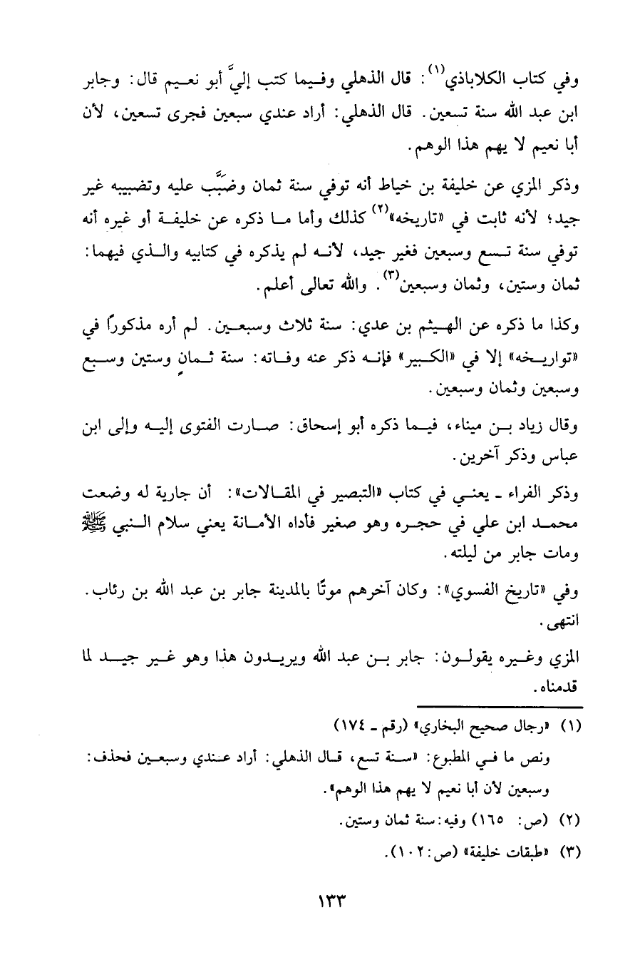 وفي كتاب الكلاباذي: قال الذهلي وفيما كتب إلي أبو نعيم قال: وجابر بن عبد الله سنة تسعين. قال الذهلي: أراد عندي سبعين فجرى تسعين، لأن أبا نعيم لا يهم هذا الوهم.