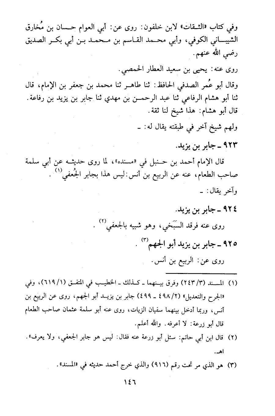 وقال أبو عمر الصدفي الحافظ: ثنا طاهر ثنا محمد بن جعفر بن الإمام، قال ثنا أبو هشام الرفاعي ثنا عبد الرحمن بن مهدي ثنا جابر بن يزيد بن رفاعة.