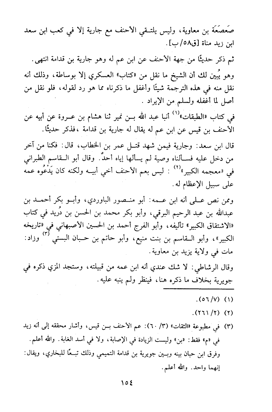 في كتاب «الطبقات» أنبأ عبد الله بن نمير ثنا هشام بن عروة عن أبيه عن الأحنف بن قيس عن ابن عم له يقال له جارية بن قدامة، فذكر حديثا.