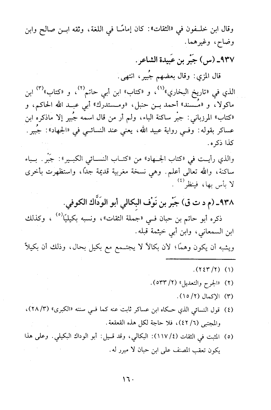 الذي في «تاريخ البخاري»، و «كتاب» ابن أبي حاتم، و «كتاب» ابن ماكولا، و «مسند» أحمد بن حنبل، «ومستدرك» أبي عبد الله الحاكم، و «كتاب» المرزباني: جبر ساكنة الباء، ولم أر من قال اسمه جبير إلا ما ذكره ابن عساكر بقوله: وفي رواية عبيد الله، يعني عند النسائي في «الجهاد»: جبير. كذا ذكره.
