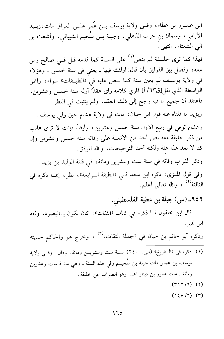 فهذا كما ترى خليفة لم ينص على السنة كما قدمه قبل في صالح ومن معه، وفصل بين القولين بأن قال: أولئك فيها – يعني في سنة خمس - وهؤلاء في ولاية يوسف لم يعين سنة كما نص عليه في «الطبقات» سواء، وأظن الواسطة الذي نقل [ق 63 / أ] المزي كلامه رأى عقدا أوله سنة خمس وعشرين، فاعتقد أن جميع ما فيه راجع إلى ذلك العقد، ولم يثبت في النظر.