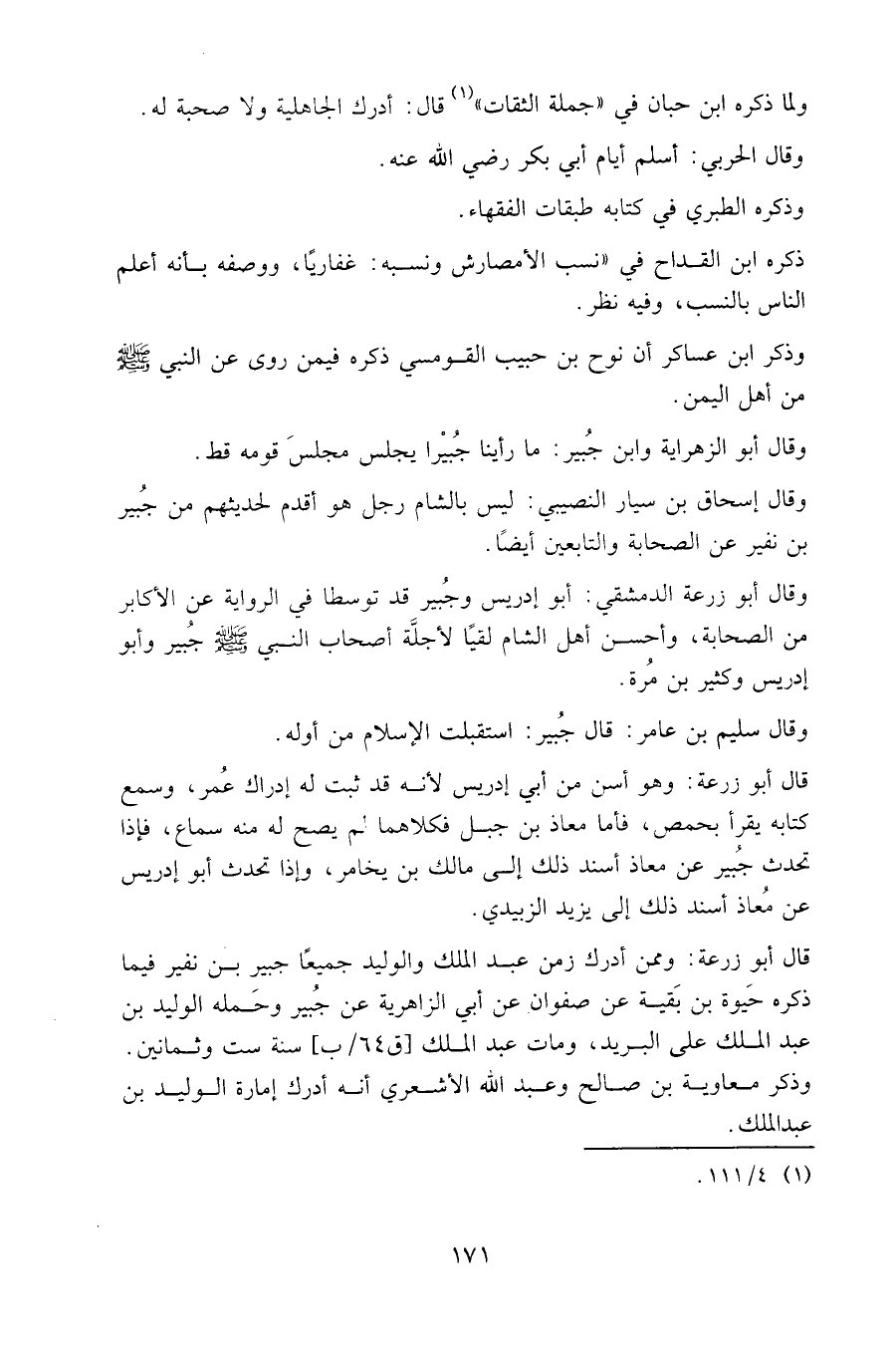 قال أبو زرعة: وهو أسن من أبي إدريس لأنه قد ثبت له إدراك عمر، وسمع كتابه يقرأ بحمص، فأما معاذ بن جبل فكلاهما لم يصح له منه سماع، فإذا تحدث جبير عن معاذ أسند ذلك إلى مالك بن يخامر، وإذا تحدث أبو إدريس عن معاذ أسند ذلك إلى يزيد الزبيدي.
