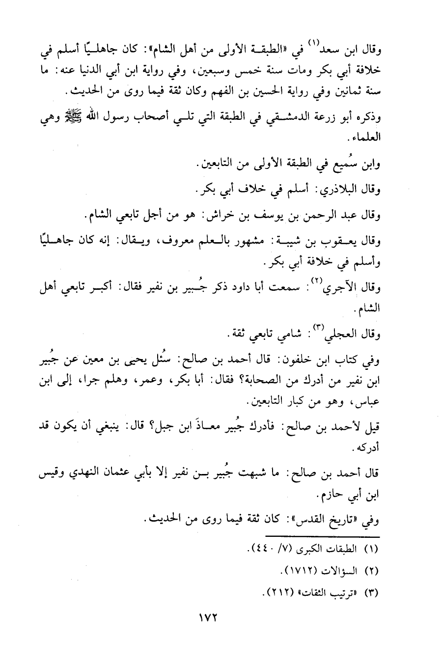 وفي كتاب ابن خلفون: قال أحمد بن صالح: سئل يحيى بن معين عن جبير بن نفير من أدرك من الصحابة؟ فقال: أبا بكر، وعمر، وهلم جرا، إلى ابن عباس، وهو من كبار التابعين.