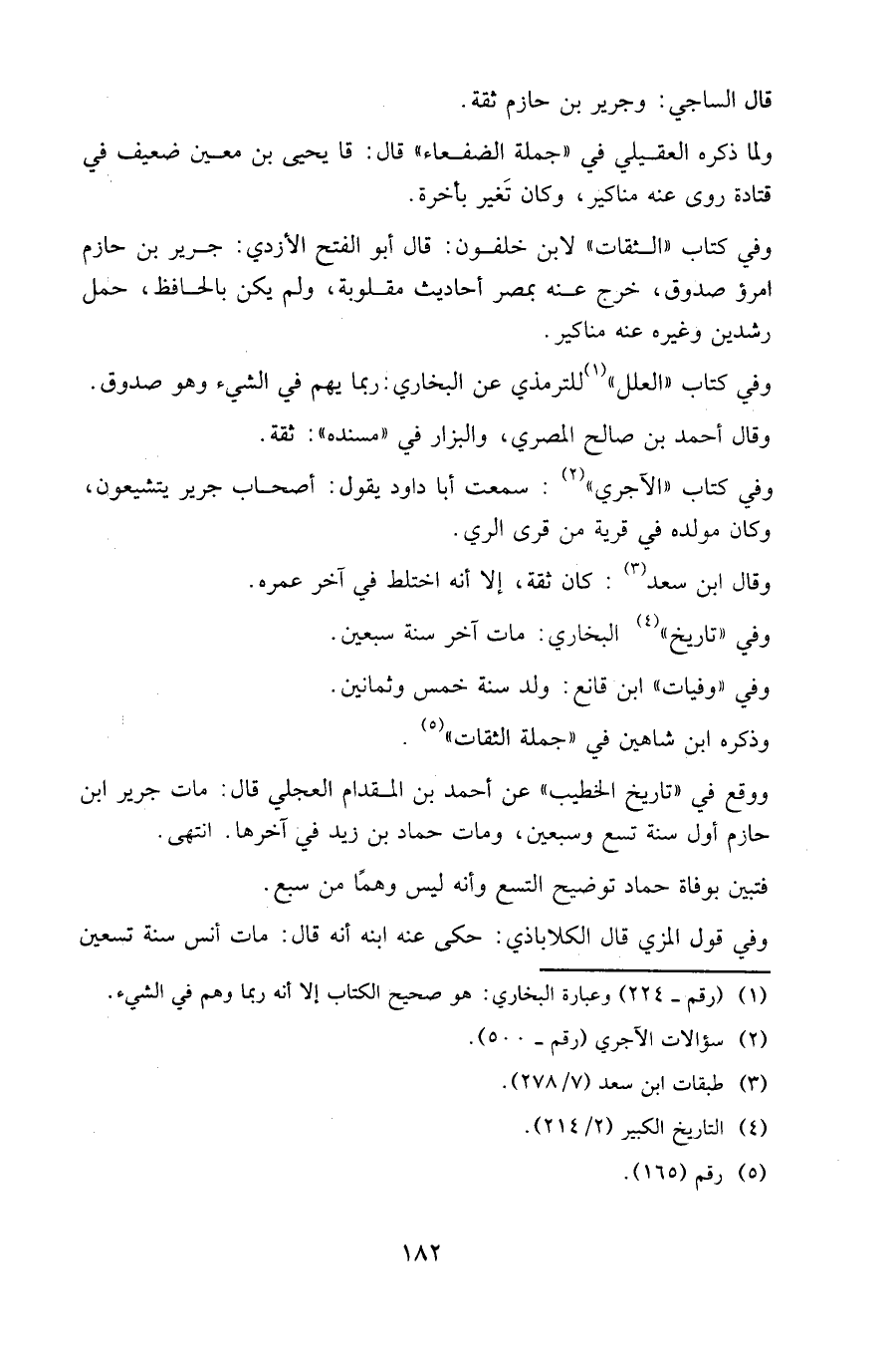 وأنا ابن خمس سنين، ومات جرير سنة سبعين ومائة، نظر، يتبين لك [. . .] ما ينقل من كتاب الكلاباذي إلا بواسطة، بيانه: قال الكلاباذي: حكى ابنه وهب عنه أنه قال: مات أنس سنة تسعين وأنا ابن خمس سنين ومات جرير سنة سبع ومائة.
