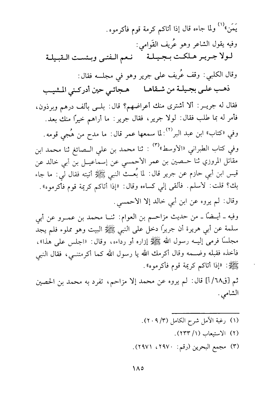 وفي كتاب الطبراني «الأوسط»: ثنا محمد بن علي الصائغ ثنا محمد ابن مقاتل المروزي ثنا حصين بن عمر الأحمسي عن إسماعيل بن أبي خالد عن قيس ابن أبي حازم عن جرير قال: لما بعث النبي صلى الله عليه وسلم أتيته فقال لي: ما جاء بك؟ قلت: لأسلم. فألقى إلي كساءه، وقال: «إذا أتاكم كريمة قوم فأكرموه».
