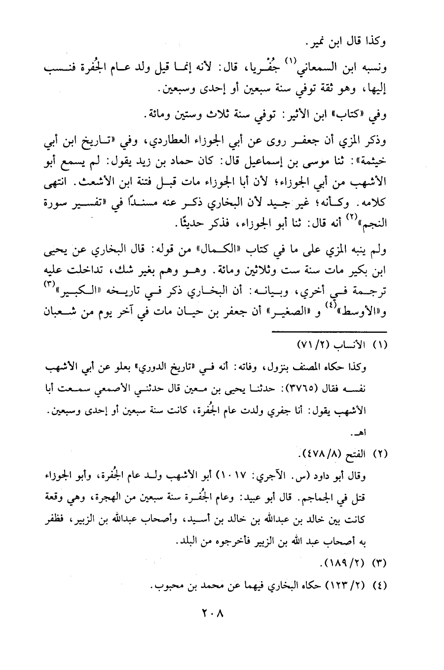 وذكر المزي أن جعفر روى عن أبي الجوزاء العطاردي، وفي «تاريخ ابن أبي خيثمة»: ثنا موسى بن إسماعيل قال: كان حماد بن زيد يقول: لم يسمع أبو الأشهب من أبي الجوزاء؛ لأن أبا الجوزاء مات قبل فتنة ابن الأشعث. انتهى كلامه. وكأنه غير جيد؛ لأن البخاري ذكر عنه مسندا في «تفسير سورة النجم» أنه قال: ثنا أبو الجوزاء، فذكر حديثا.