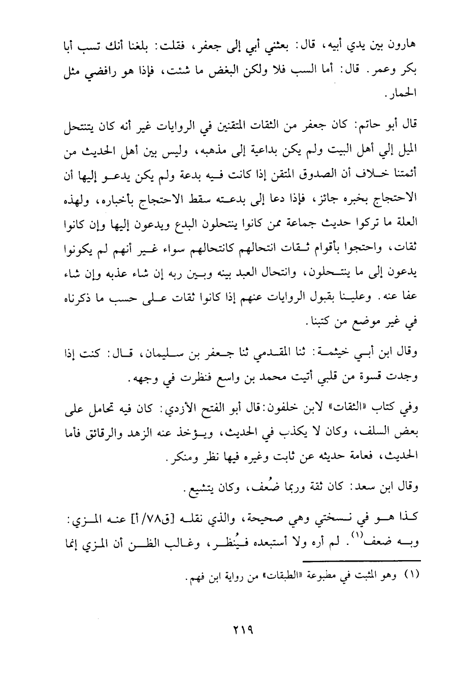 قال أبو حاتم: كان جعفر من الثقات المتقنين في الروايات غير أنه كان يتنتحل الميل إلى أهل البيت ولم يكن بداعية إلى مذهبه، وليس بين أهل الحديث من أئمتنا خلاف أن الصدوق المتقن إذا كانت فيه بدعة ولم يكن يدعو إليها أن الاحتجاج بخبره جائز، فإذا دعا إلى بدعته سقط الاحتجاج بأخباره، ولهذه العلة ما تركوا حديث جماعة ممن كانوا ينتحلون البدع ويدعون إليها وإن كانوا ثقات، واحتجوا بأقوام ثقات انتحالهم كانتحالهم سواء غير أنهم لم يكونوا يدعون إلى ما ينتحلون، وانتحال العبد بينه وبين ربه إن شاء عذبه وإن شاء عفا عنه. وعلينا بقبول الروايات عنهم إذا كانوا ثقات على حسب ما ذكرناه في غير موضع من كتبنا.