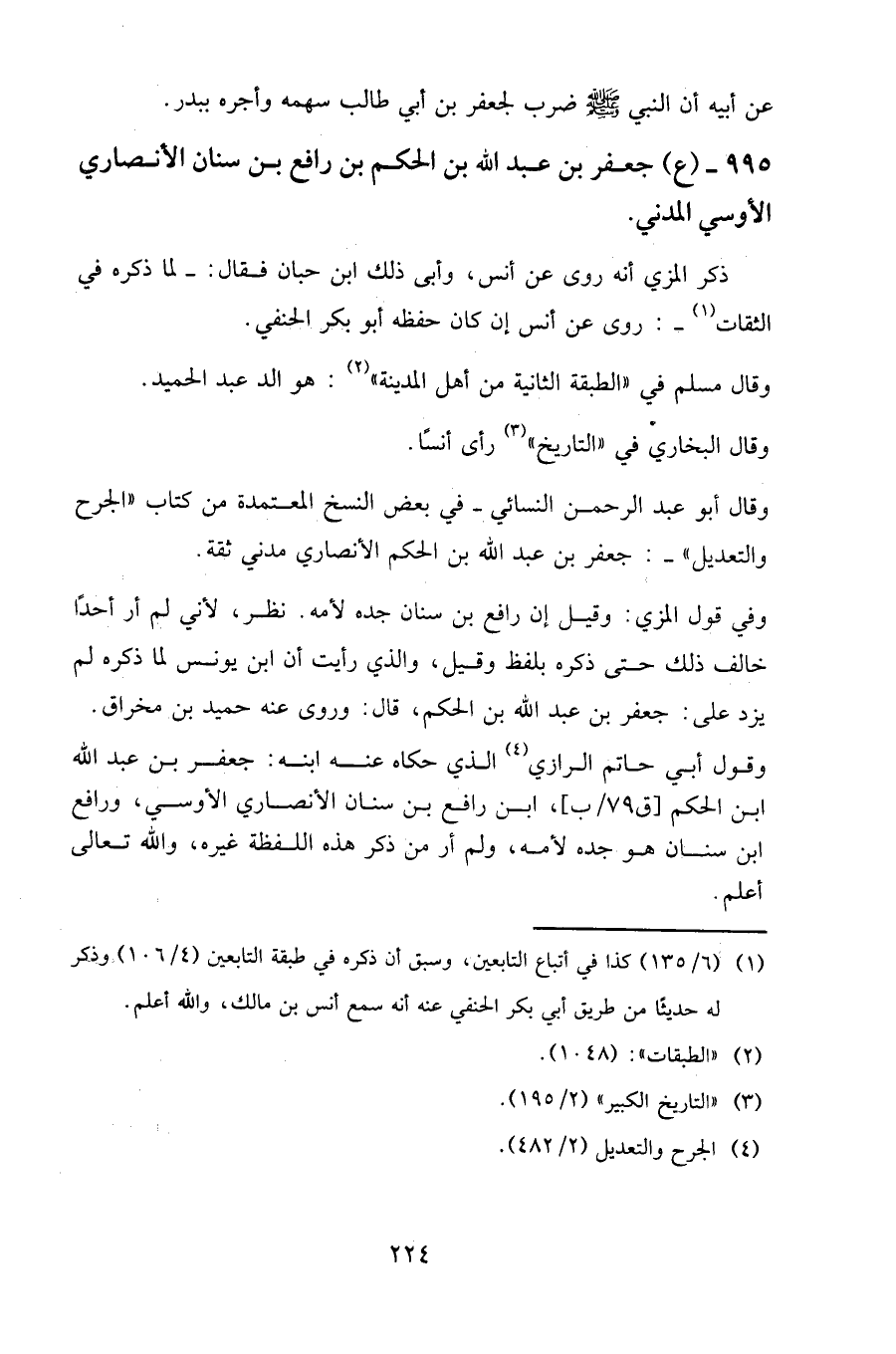 995 - (ع) جعفر بن عبد الله بن الحكم بن رافع بن سنان الأنصاري الأوسي المدني.