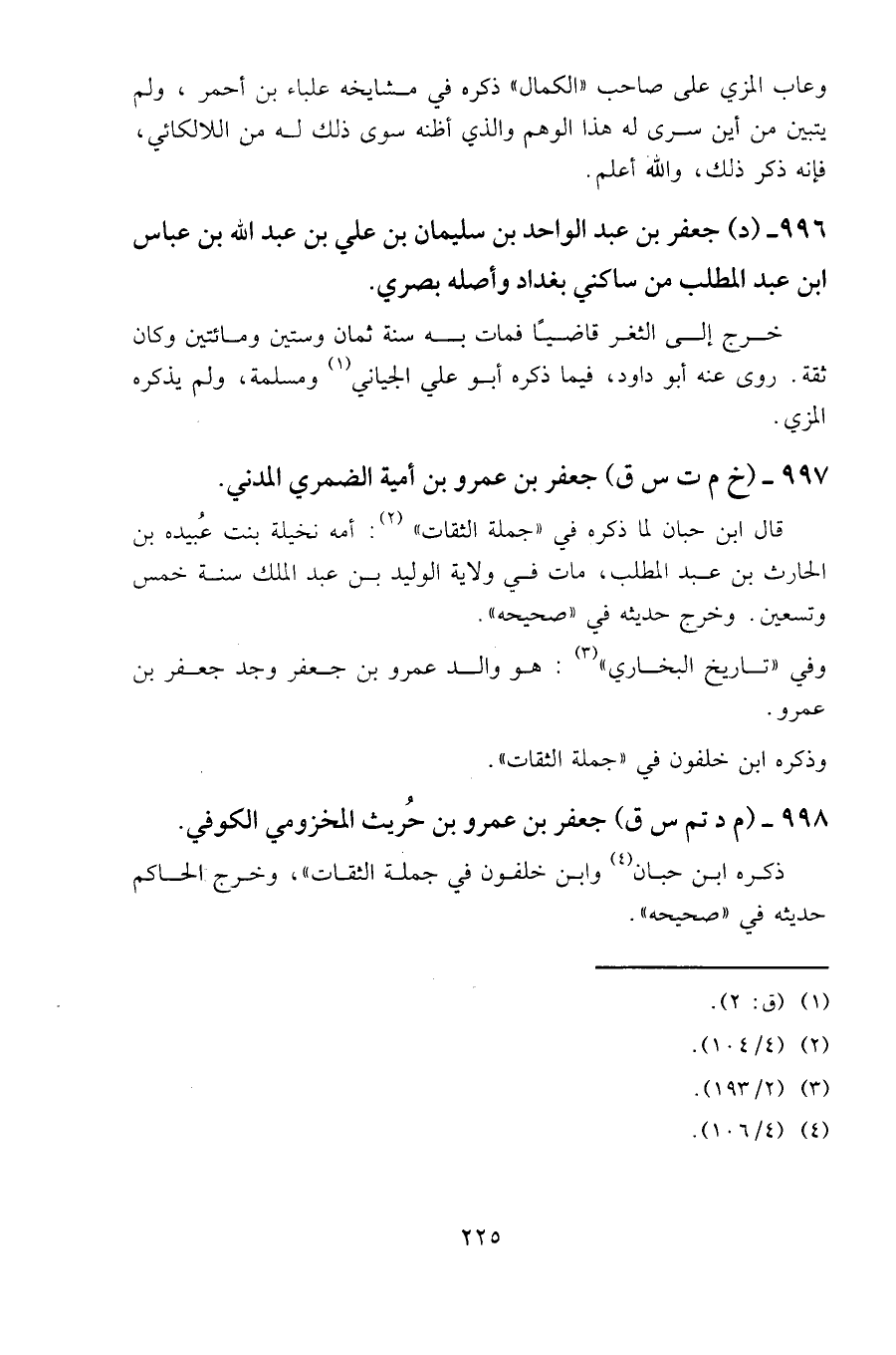 996 - (د) جعفر بن عبد الواحد بن سليمان بن علي بن عبد الله بن عباس بن عبد المطلب من ساكني بغداد وأصله بصري.