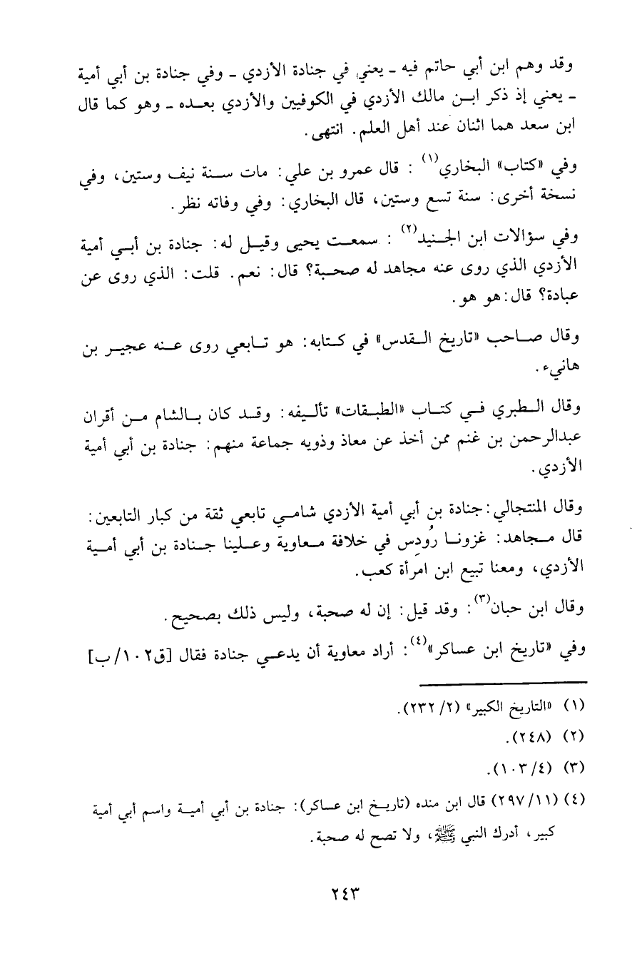 وفي سؤالات ابن الجنيد: سمعت يحيى وقيل له: جنادة بن أبي أمية الأزدي الذي روى عنه مجاهد له صحبة؟ قال: نعم. قلت: الذي روى عن عبادة؟ قال: هو هو.