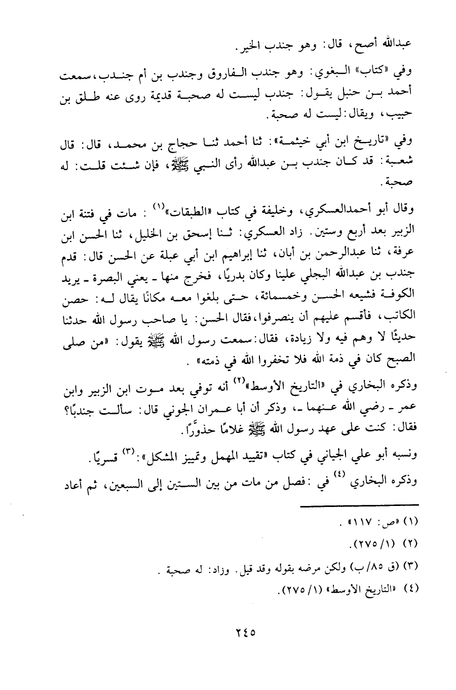 وفي «تاريخ ابن أبي خيثمة»: ثنا أحمد ثنا حجاج بن محمد، قال: قال شعبة: قد كان جندب بن عبد الله رأى النبي صلى الله عليه وسلم، فإن شئت قلت: له صحبة.