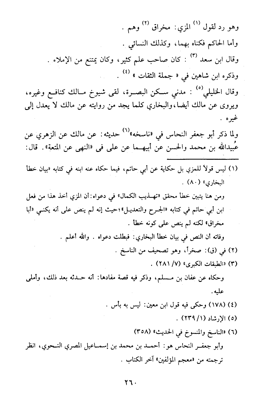 ولما ذكر أبو جعفر النحاس في «ناسخه» حديثه: عن مالك عن الزهري عن عبيد الله بن محمد والحسن عن أبيهما عن علي في «النهي عن المتعة». قال:
