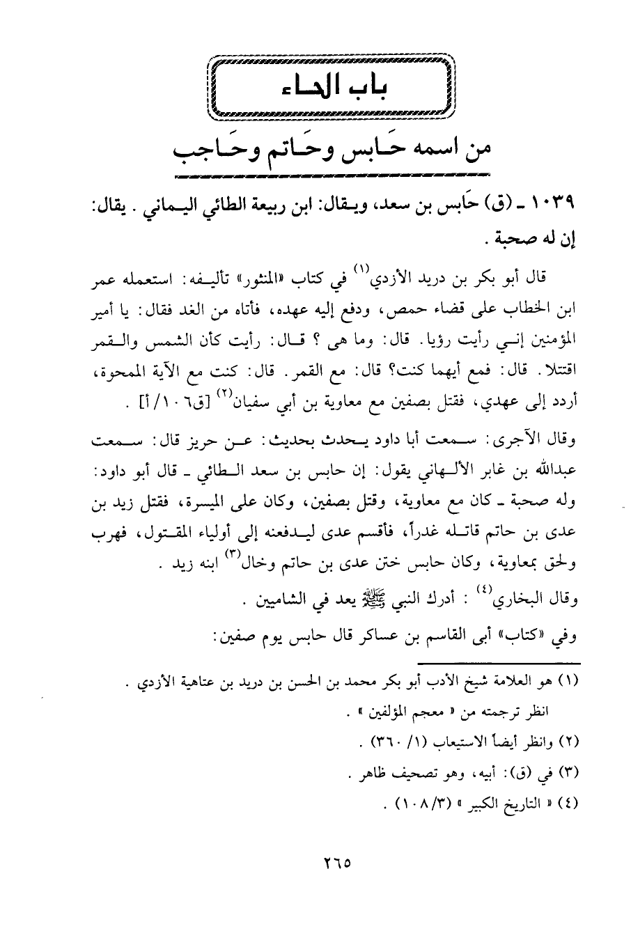 وفي «كتاب» أبي القاسم بن عساكر قال حابس يوم صفين: