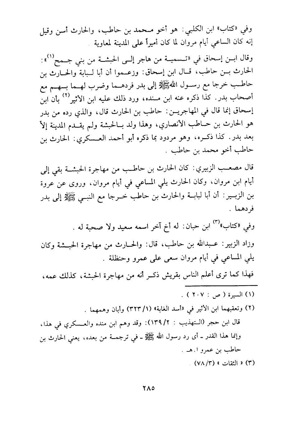 وفي «كتاب» ابن الكلبي: هو أخو محمد بن حاطب، والحارث أسن وقيل: إنه كان الساعي أيام مروان لما كان أميرا على المدينة لمعاوية.